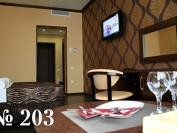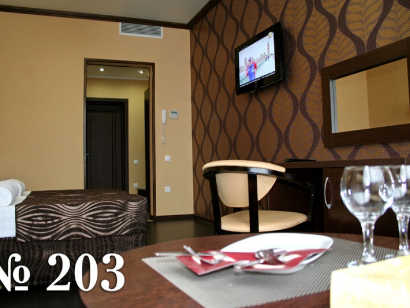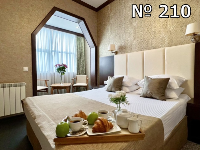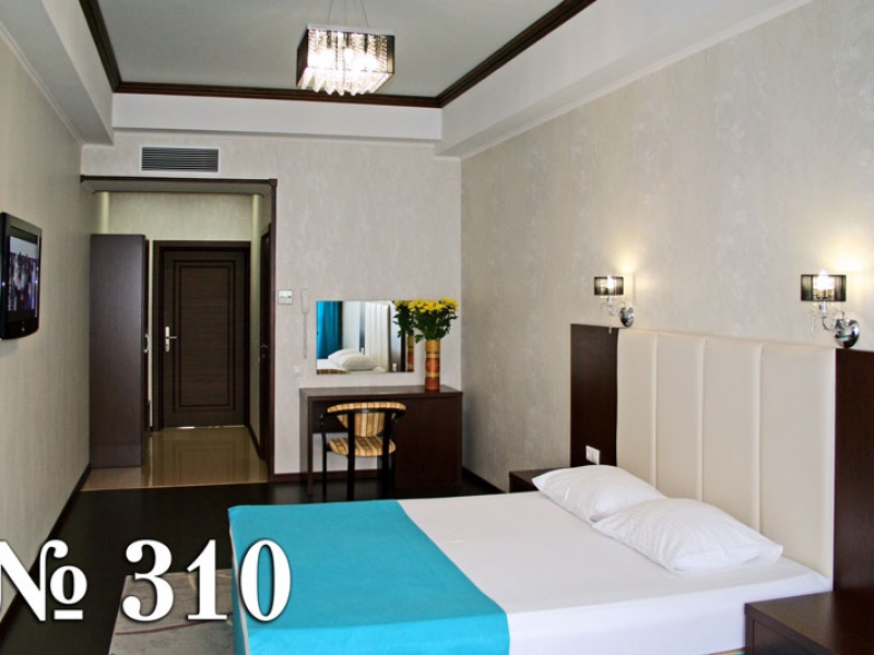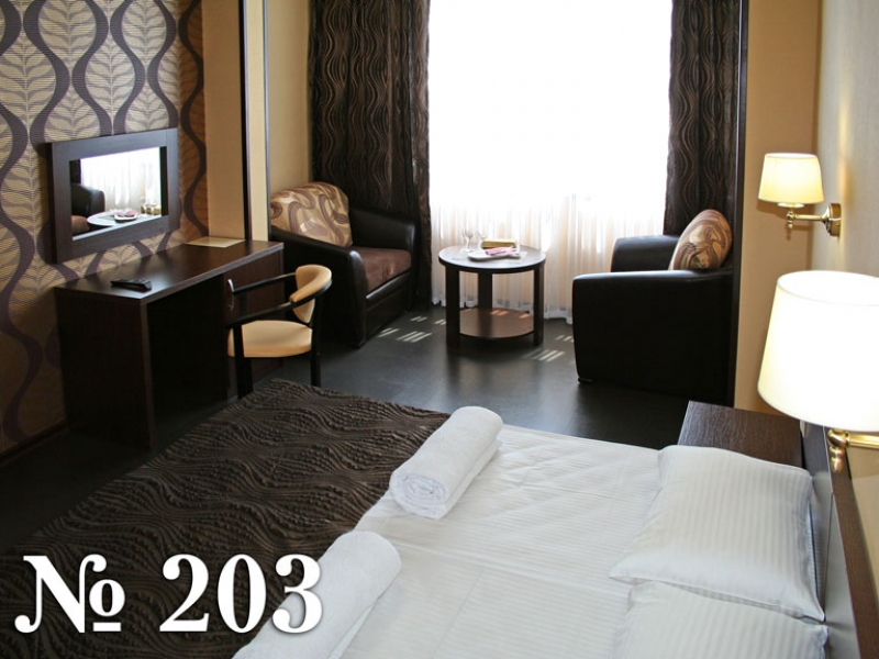 Все номера 1 категории «Стандарт» оснащены комплектами удобной современной мебели: двуспальная «французская» кровать (в номерах 202, 204, 301, 306) или раздельные кровати (в номерах 206, 302, 304) с прикроватными тумбочками и настенными бра, рабочий стол, шкаф для одежды и вещей, коктейльный столик, набор тарелок, бокалов и фраже.