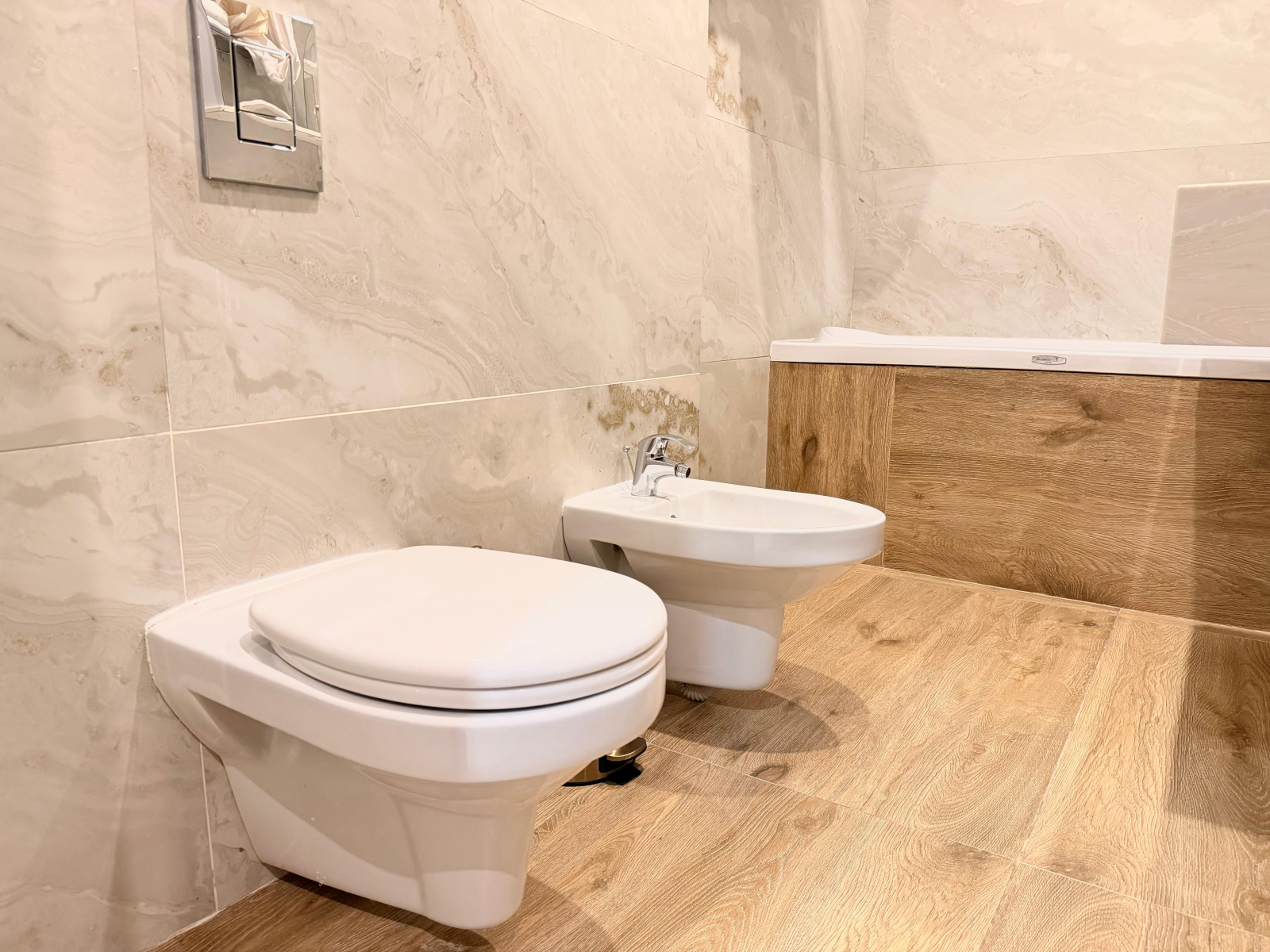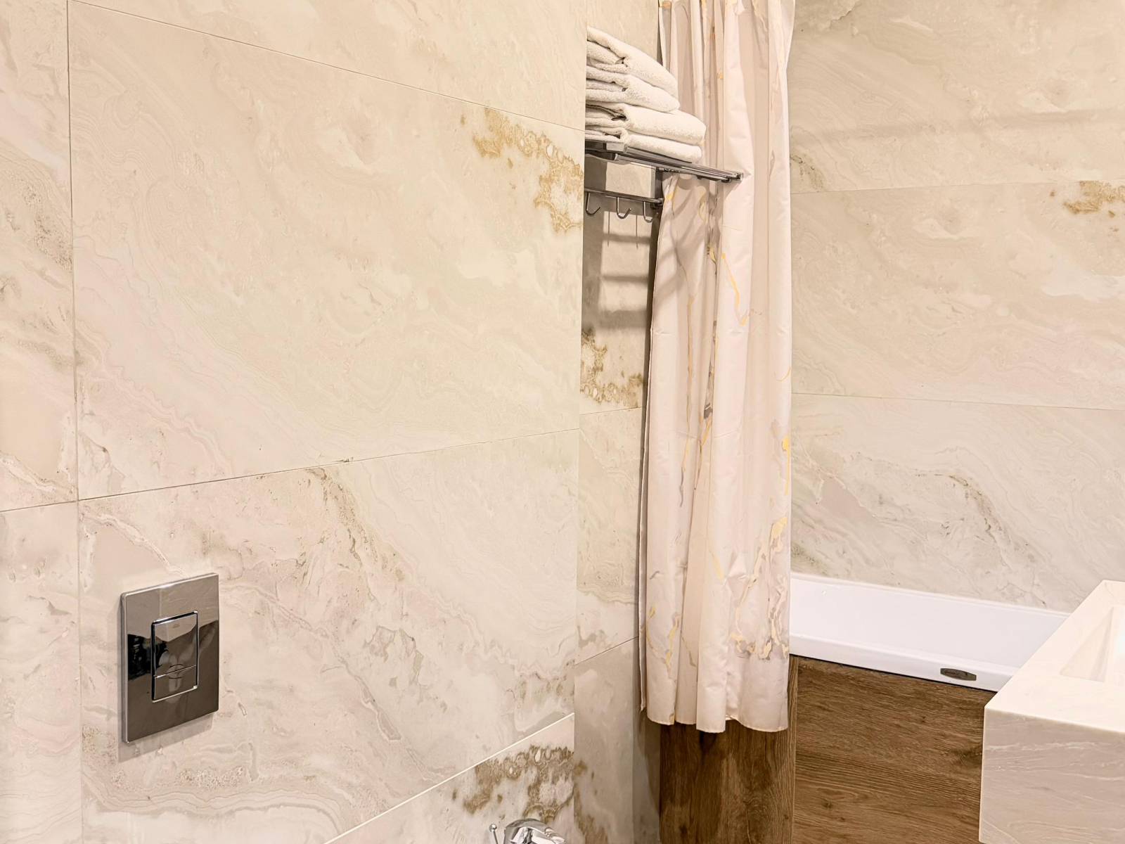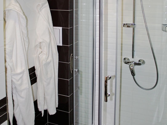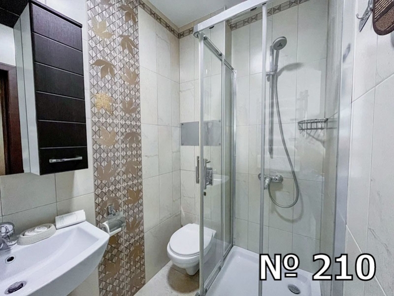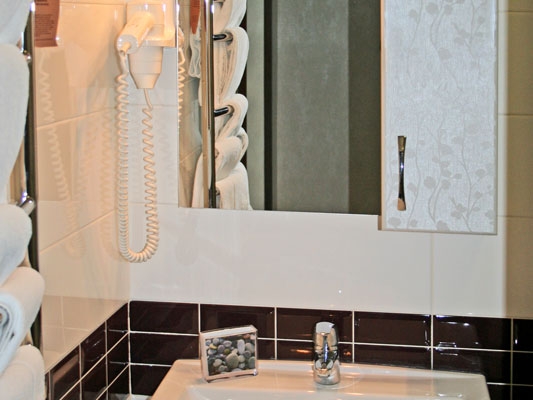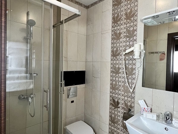 Ванная комната оборудована современной сантехникой: санузлом, душевой кабиной, раковиной, феном. Для каждого гостя приготовлены: халат, тапочки, набор банных и пляжных (в летнее время) полотенец, туалетные принадлежности: шапочка для душа, мыло, шампунь, гель для душа, зубная паста и щётка, бритвенный станок.